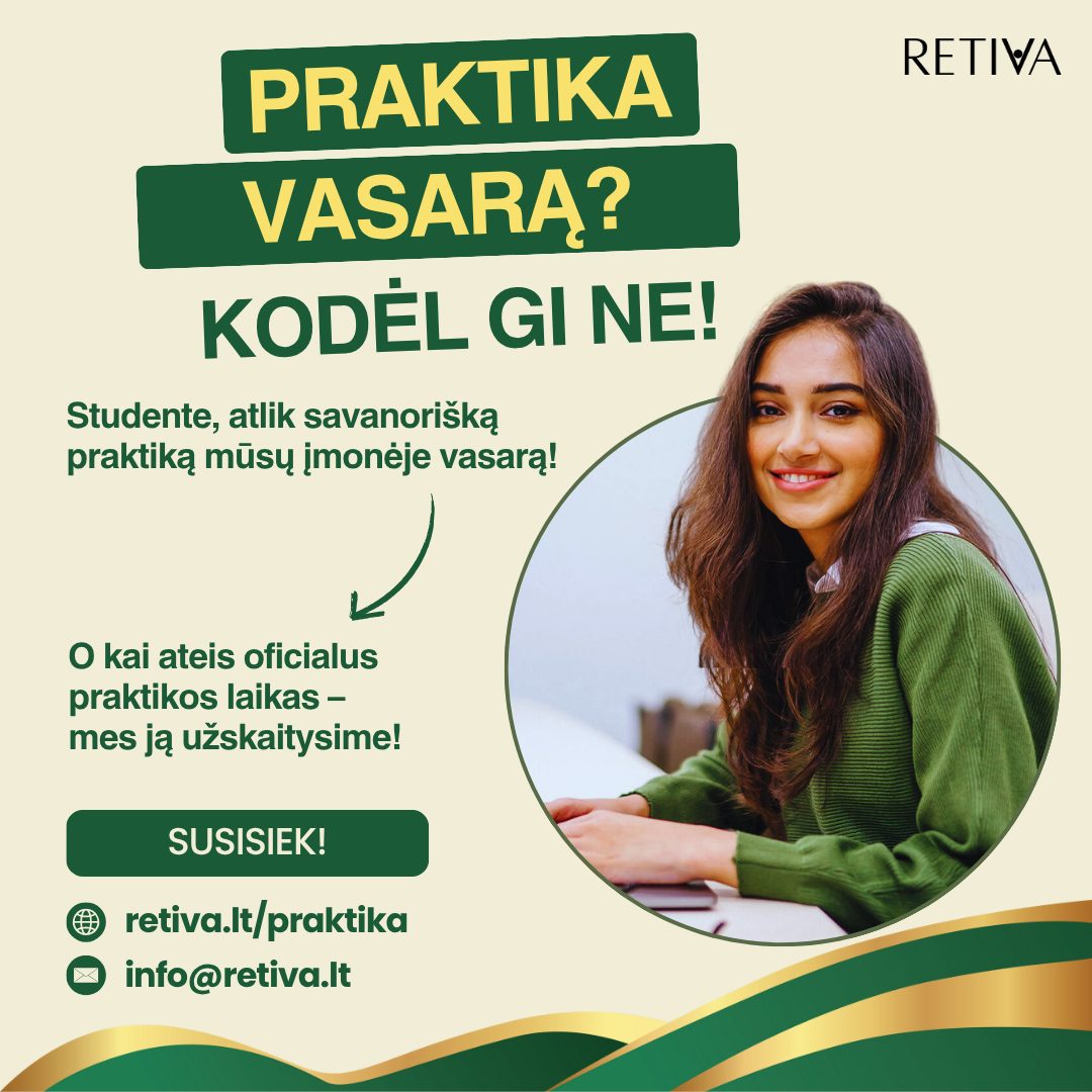 „Atlikau praktiką įmonėje ,,Retiva”. Per praktikos laikotarpį turėjau galimybę gilinti savo žinias ir įgūdžius, susijusius su biuro administravimu. Visa tai buvo puiki galimybė pritaikyti teorines žinias ir susipažinti su kasdieninėmis biuro administratoriaus užduotimis, tokiomis kaip dokumentų tvarkymas ir biuro priežiūra. Mane palaikė nuostabi komanda, visi kolegos buvo kantrūs ir draugiški. Darbo aplinka buvo teigiama ir motyvuojanti, kas man padėjo tobulėti ne tik profesiškai, bet ir asmeniškai. Atlikus praktiką man buvo suteikta galimybė įsidarbinti šioje įmonėje. Džiaugiuosi gavusi šią progą ir galėsiu toliau dirbti su šaunia komanda bei prisidėti prie įmonės sekmės.”